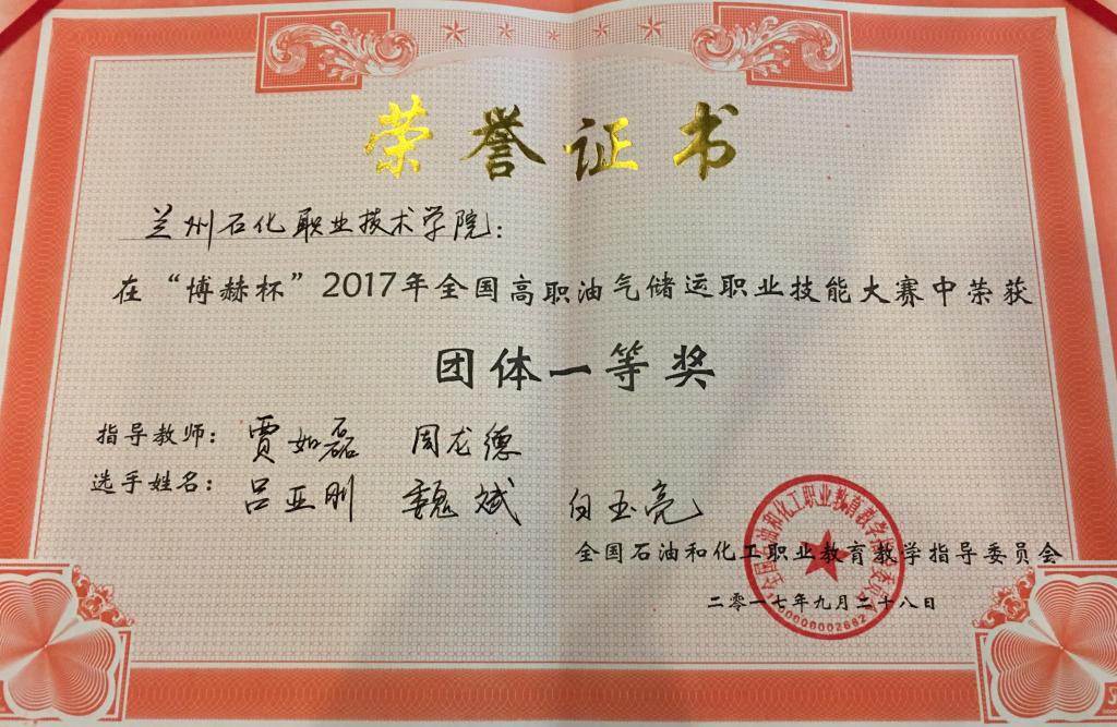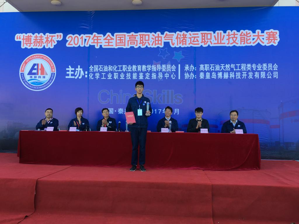 9月27-28日,由中国化工教育协会、全国石油和化工职业教育教学指导委员会、化学工业职业技能鉴定指导中心主办,高职石油天然气工程类专业委员会承办、秦皇岛博赫科技开发有限公司协办的“博赫杯”2017年全国高职油气储运职业技能大赛在秦皇岛举行,全国共12所本专科院校参赛。我校yl6809永利集团代表队勇夺大赛设立的唯一一个团体一等奖,贾如磊和周龙德两位教师获得优秀指导教师称号。