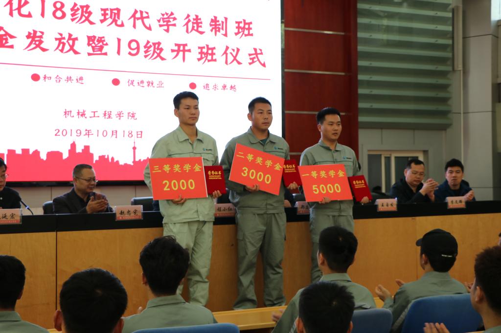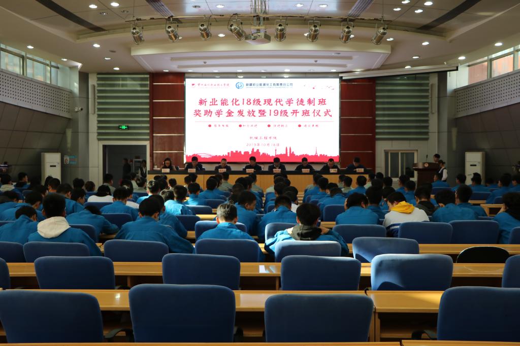 仪式上,新业能化群众工作部部长、团委书记王自发宣读了新业能化18级现代学徒制班奖学金、助学金、优秀学生干部的表彰决定,并对获奖的23位优秀学生和2位优秀学生干部颁发奖助学金及荣誉证书,同时向19级学徒制班学员代表发放工作服。