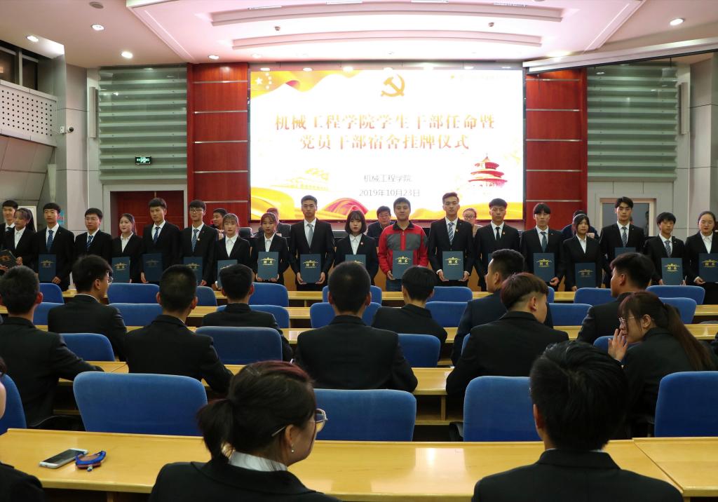 为开展好学校“不忘初心、牢记使命”主题教育活动,落实好学校“一学五查双促进”专项教育整治工作,充分发挥党员、学生干部先锋模范带头作用,进一步树立党员意识,铭记干部使命,10月23日晚,yl6809永利集团在学校多功能报告厅隆重举行学生干部任命暨党员干部宿舍挂牌仪式。学院领导、辅导员、全体学生干部、在校预备党员、入党积极分子及17、18、19级各班班长及团支书参加了此次大会,大会由学院辅导员郭世军主持召开。