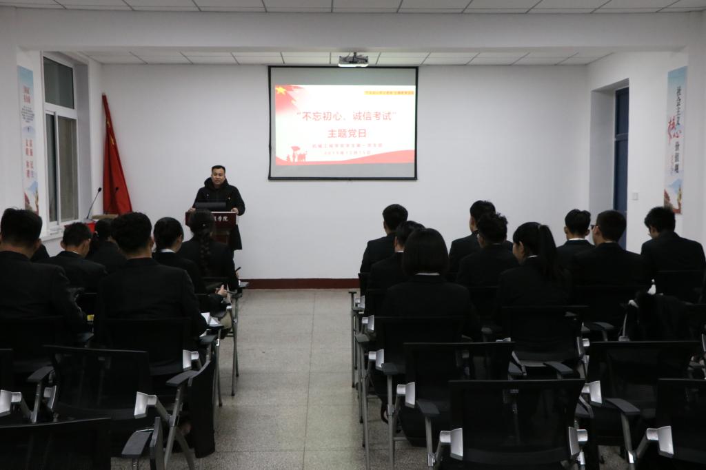 为了持续深入推进“不忘初心、牢记使命”主题教育,在期末考试即将来临之际,为树立大学生诚信品质,严肃考风考纪,12月15日晚,yl6809永利集团学生第一党支部将主题教育与实际工作紧密联系,在党员之家开展了“不忘初心、诚信考试”主题党日活动。参加本次活动的有学生第一支部全体预备党员。活动由支部书记周龙德主持。