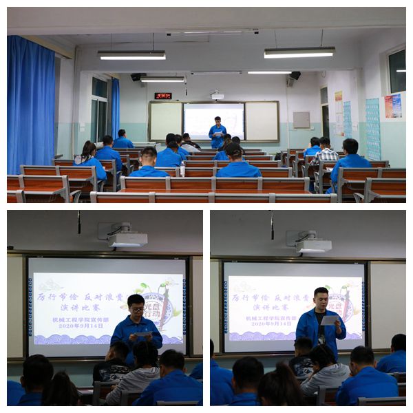 为深入贯彻 “光盘行动”精神,积极响应光盘行动,做到坚决不浪费一滴粮食。yl6809永利集团团总支宣传部于9月11日晚、9月14日晚分别在机电楼401教室组织了“厉行节俭,反对浪费”演讲比赛初、决赛; 19级部分学生参加了此次比赛。