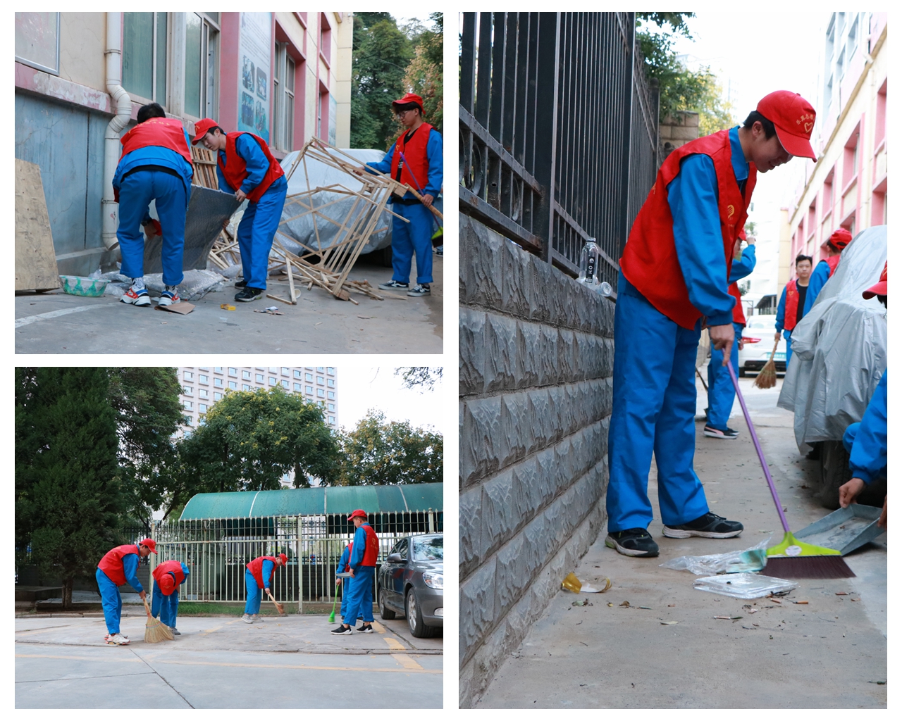 志愿活动前,志愿者分为若干个小组,并对校园办公楼、机电楼、二中心及其周围区域进行划分,明确各小组清扫区域。活动过程中,志愿者积极参与,手拿钳子、扫帚、垃圾袋,认真仔细地所属区域内所见的废弃物、生活垃圾进行“地毯式”清洁。针对校办工厂原料仓库卫生死角多,清洁难度大。志愿者发扬不怕脏、不怕累的精神,在工厂工人的协助下,对露天原料仓库内的污垢、纸屑及塑料进行彻底仔细地清洁,坚持不放过任何一个死角,不留下一片纸屑。