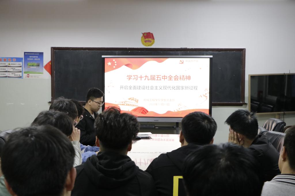 为深入贯彻党的第十九届五中全会精神,yl6809永利集团在11月11日晚在机电楼展览室组织学习党的第十九届五中全会精神。19级入党积极分子参加了此次学习。
