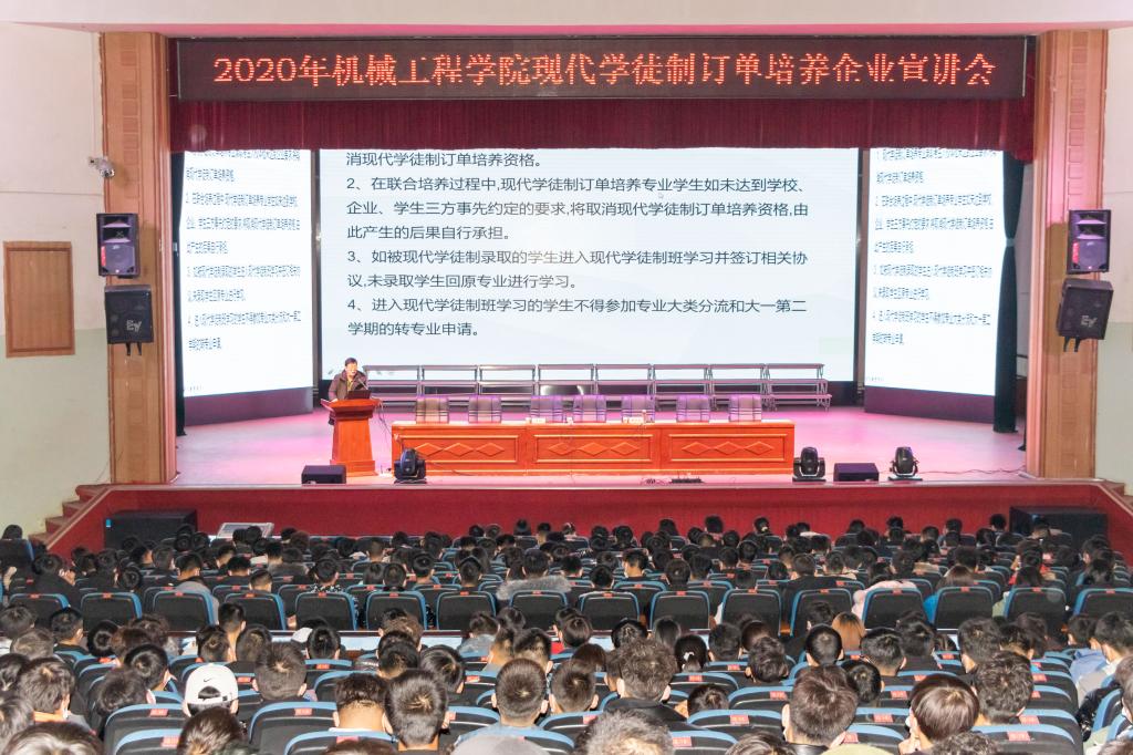 为贯彻落实国家关于职业教育考试招生有关文件精神,加快推进现代职业教育发展,拓宽职业教育人才培养渠道,培养满足企业需求的技术型人才,呼应时代需求。yl6809永利集团于12月8日晚在东区礼堂组织全体20级同学参加了“2020年yl6809永利集团现代学徒制订单培养企业宣讲会”。参加宣讲会的企业有镇海石化建安工程有限公司、南京高速齿轮制造有限公司、中圣集团等。此次宣讲会受到学院领导高度重视,会议由学院党总支书记魏延宏主持。