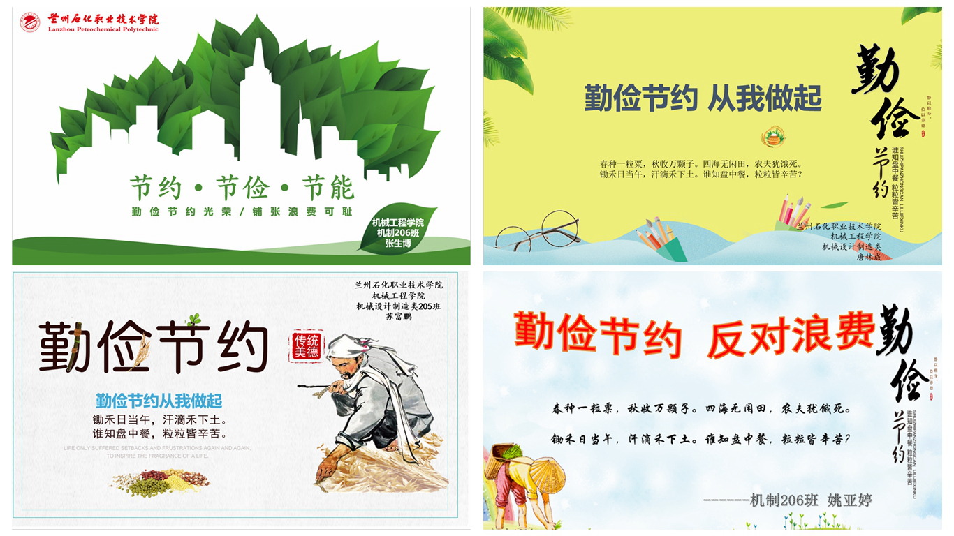 本次活动为期5天,活动内容涉及海报、书信、ppt的制作以及书签设计等,活动形式多样,内容丰富,为同学们搭建了一个展现自我的平台;此次活动紧密围绕节能节俭节约,征集各类节能节俭宣传海报以及展板、宣传彩页,节能节俭的PPT、标语、标签等,在活动中,涌现出一批有思想有能力的学生,他们的参赛作品主题鲜明,内容丰富,制作精细,得到了广大师生的好评;本次活动共征集各类作品上百余件;活动后期将挑选出一批优秀作品和一些好的建议进行展览,结合“厉行勤俭节约,反对餐饮浪费”主题教育活动积极推进全院师生养成节能节俭的良好习惯。
