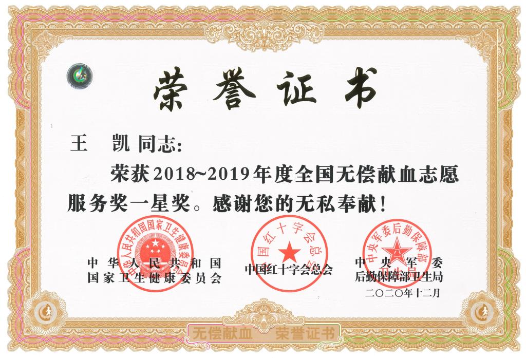 近日,国家卫生健康委员会、中国红十字会总会、中央军委后勤保障部卫生局联合组织召开2018-2019年度全国无偿献血表彰电视电话会议,会议表彰了无偿献血先进集体和个人。我院王凯、李勇、管鹏三名同学荣获2018-2019年度全国无偿献血志愿服务一星奖。