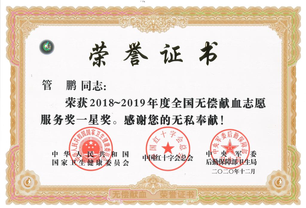 近日,国家卫生健康委员会、中国红十字会总会、中央军委后勤保障部卫生局联合组织召开2018-2019年度全国无偿献血表彰电视电话会议,会议表彰了无偿献血先进集体和个人。我院王凯、李勇、管鹏三名同学荣获2018-2019年度全国无偿献血志愿服务一星奖。