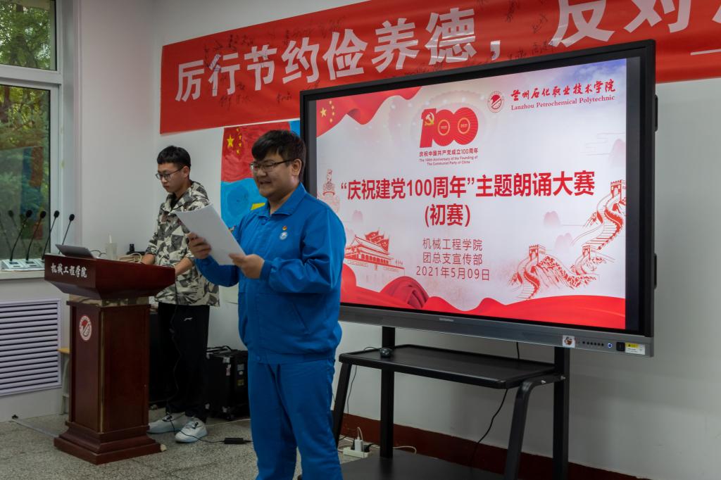 活动伊始,主持人首先宣读了比赛流程以及评分标准。在比赛现场,选手们激情饱满,在音频、视频辅助下以铿锵有力的气势,充沛饱满的情感,自信大方的形象赢得评委和同学们的阵阵掌声。其中雷建兵同学的声音铿锵洪亮,结合配乐,展现出朗诵的魅力,最终赢得了初赛冠军。