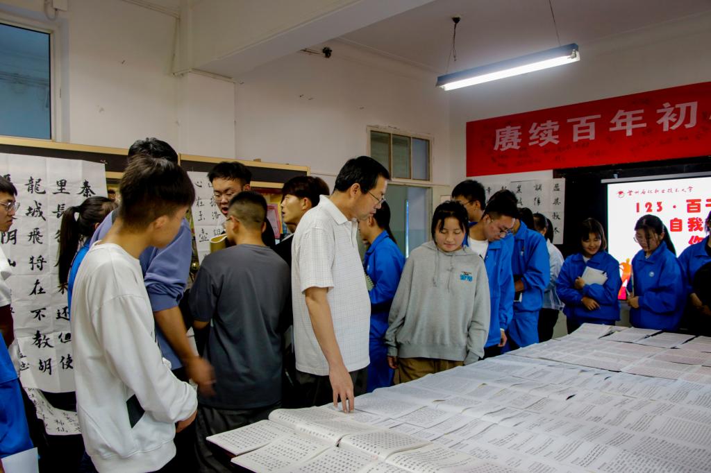 为提高学生作业的书写水平和规范意识,使广大学生树立正确的学习态度和良好的学习习惯。9月24日午,yl6809永利集团团总支社会实践部在机电楼展览室组织开展了“123百千万”百日素质自我提升作业展评活动。党总支副书记王小芬、辅导员、21级各班班委参加了此次展评活动。