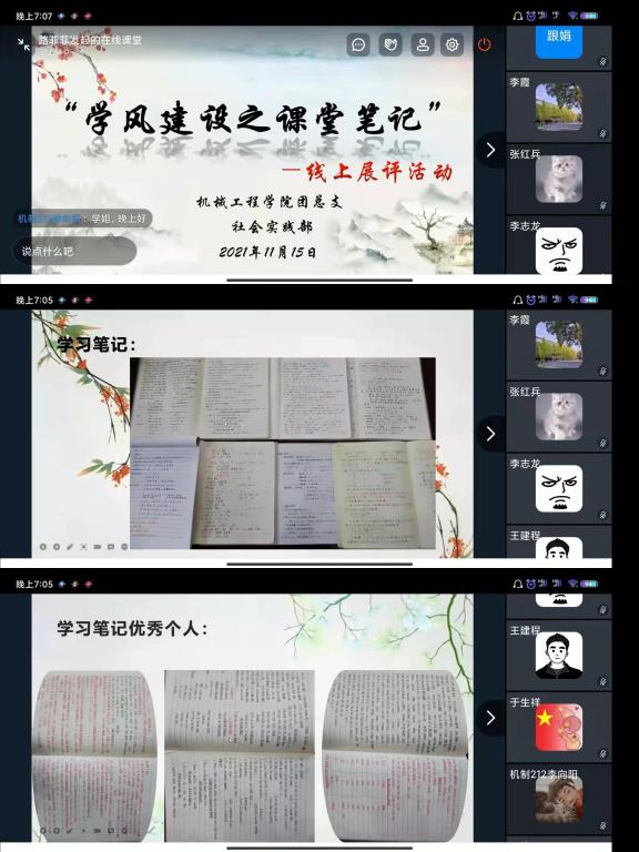 为防止评选活动浮在表面,流于形式。评选过程结束后,社会实践部进行了学习笔记线上展评,共展出20余份优秀学习笔记,20级、21级班级负责人共同参与了此次展评。展评中所展示的笔记清晰明了地记录了疫情防控期间同学们在宿舍有效开展线上课程学习、线下自我学习的成果。希望通过此次线上展评,我院学生可以树立良好榜样、相互分享学习经验,营造浓厚的学习氛围。