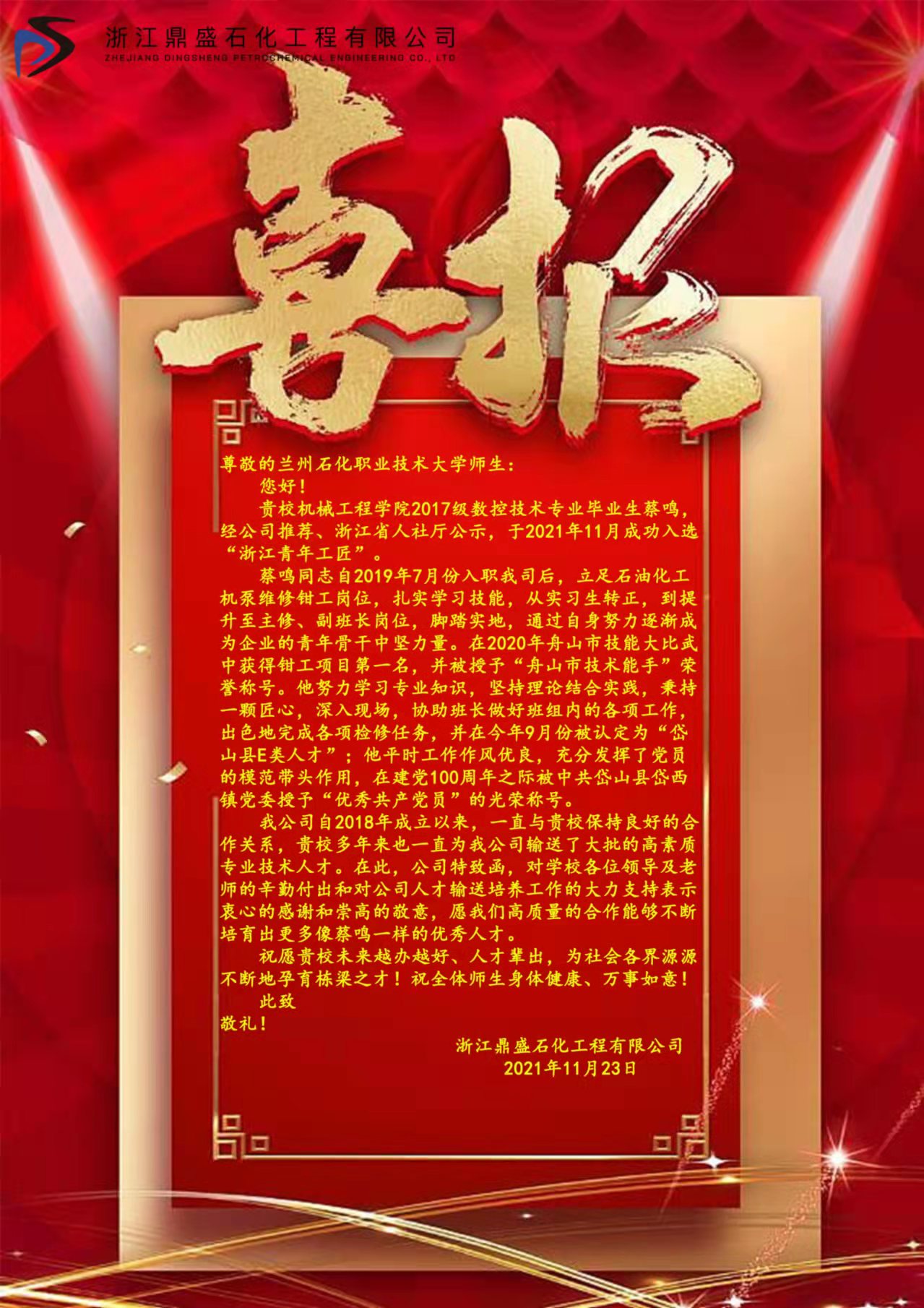 他2019年7月进入浙江鼎盛石化有限公司实习。实习期间,他立足于石油化工机泵维修钳工岗位,刻苦学习,虚心请教,在2019年11月公司的钳工技能比武中获第三名,并获得公司2019年度“优秀实习生”称号。