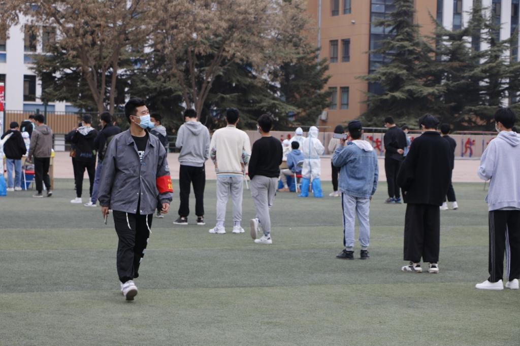 在核酸检测工作中,志愿者们身戴红袖章、组织有序、分工明确。检测开始前,志愿者们有条不紊的开展着各项工作,他们动作规范地按照时间安排提前组织好学生队伍,引导学生在图书馆门前有序集合,并提醒学生戴好口罩,间隔一米,排队进入操场。随后,志愿们分组带领各班有序地在几个核酸检测点排队等候。检测工作开始后,志愿者们有的维持核酸检测队伍秩序,提醒学生前后间隔一米距离;有的引导后来学生有序排队,不随意走动;有的则是提醒同学们提前准备好健康码等。样本采集结束后,志愿者组织学生迅速离开检测点,极力避免人群聚集。在志愿者的积极引导和学生的高度配合下,学校第三次全员核酸检测顺利而高效地完成了。