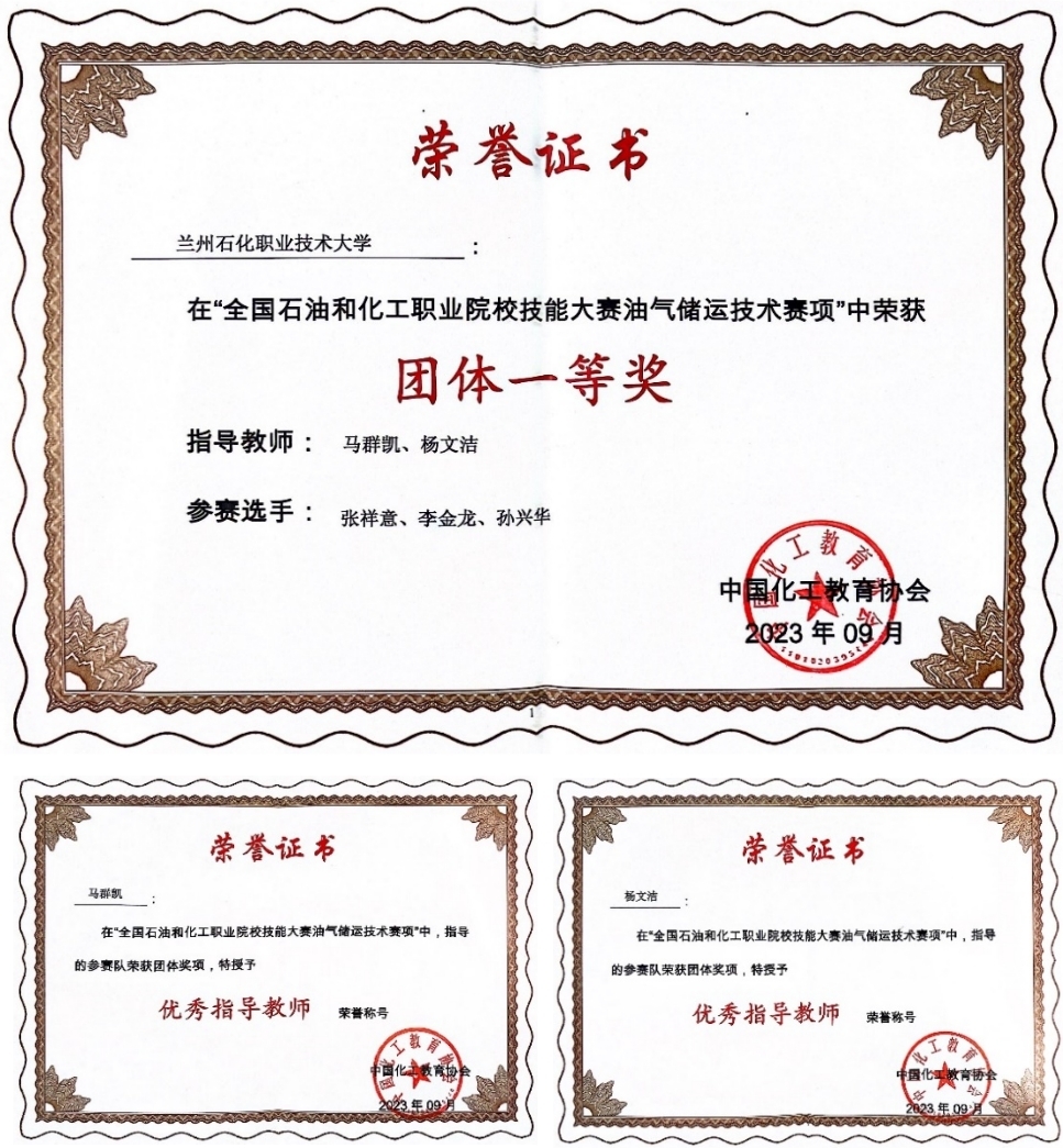 yl6809永利集团领导对本次大赛高度重视、亲切关怀,指导老师严谨认真、全力备赛。通过层层选拔,油气储运技术专业的张祥意、李金龙、孙兴华脱颖而出。三位参赛选手团结协作、沉着冷静,以扎实的基本功应对挑战。经过激烈角逐,我校代表队获得团体一等奖,我校yl6809永利集团马群凯、杨文洁两位教师获得“优秀指导教师”荣誉称号。