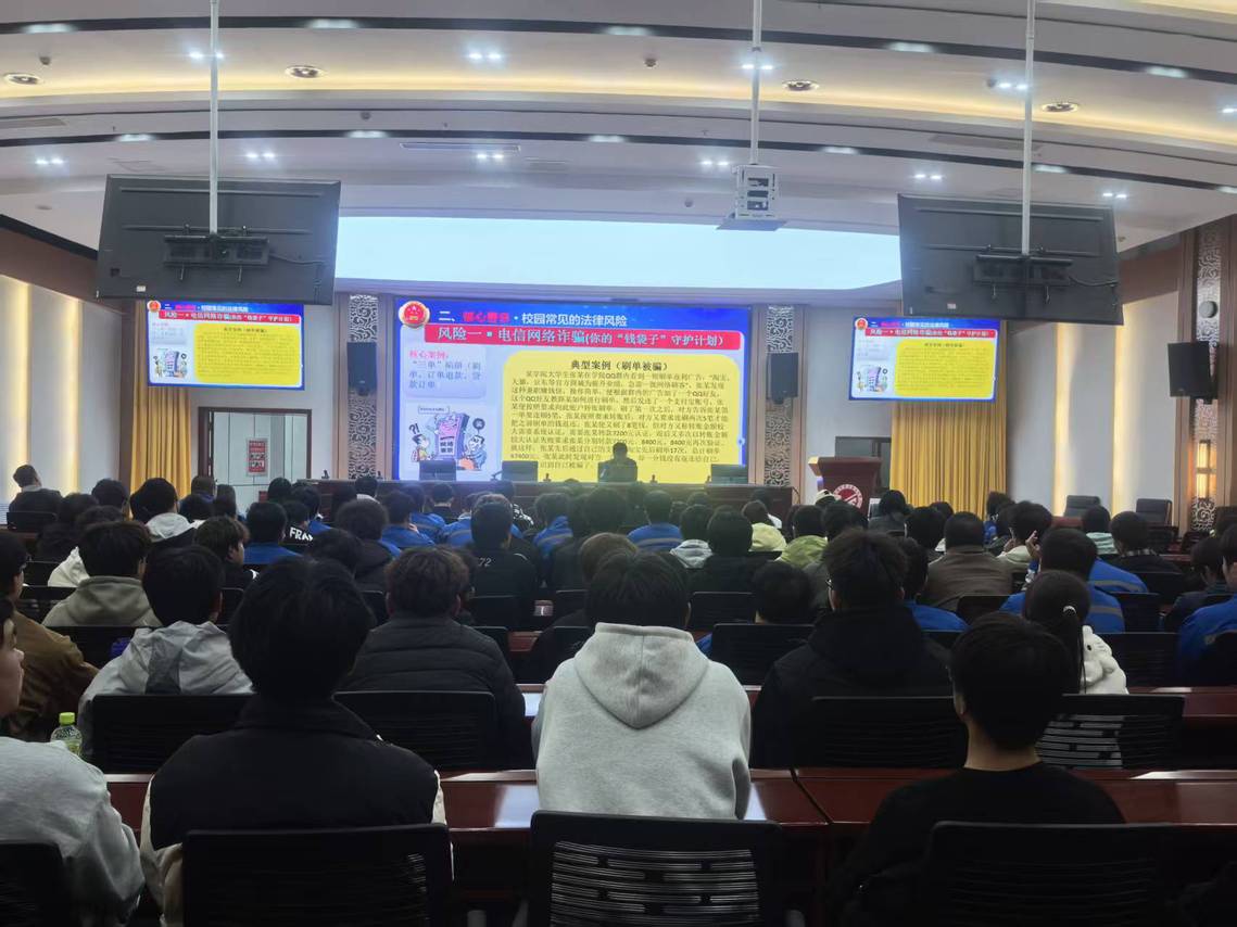 主讲人紧扣“新时代青年法治素养”主线,以“校园法律风险识别与防范”为核心,结合典型案例剖析电信网络诈骗、校园贷、人身侵权等高发风险点。针对电信网络诈骗,他通过“刷单返利被骗”“虚假订单退款诈骗”等真实案例,拆解诈骗分子利用学生社会经验不足、消费需求旺盛实施犯罪的套路,点出“轻松赚大钱”“无抵押低息贷款”等话术背后的法律风险。为筑牢反诈防线,他总结“防骗三原则”:拒绝诱惑,树立正确价值观;保持警惕,通过官方核实身份;坚守底线,遇可疑情况及时求助。同时,他介绍了“全国反诈专线96110”与“国家反诈中心APP”功能,引导学生运用法治工具维权。