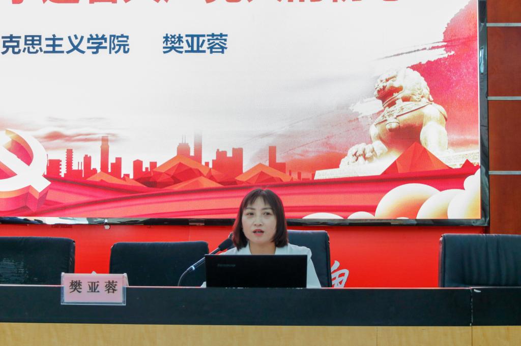 接下来,樊亚蓉老师作了“从英模事迹看共产党人的初心”为题目的专题党课辅导。她通过北伐名将叶挺同志、在新冠肺炎疫情防控斗争中在一线英勇奋战的逆行者、云南省原保山地委书记杨善洲同志、“当代雷锋”郭明义同志等一代又一代共产党人的英雄楷模事迹,阐明了 “为人民谋幸福,为民族谋复兴”是中国共产党人始终不渝的初心。