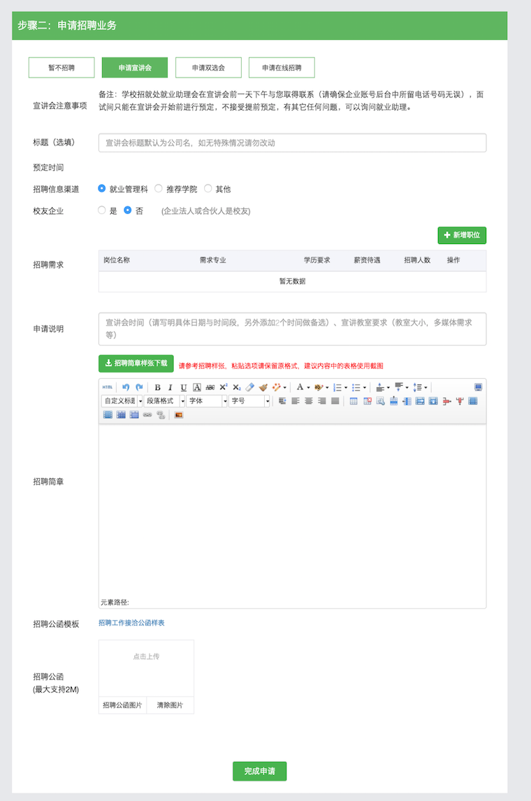 第二步:“步骤二:申请招聘业务”,根据招聘选择类型,并填写相关申请资料,最后点击“完成申请”即可。