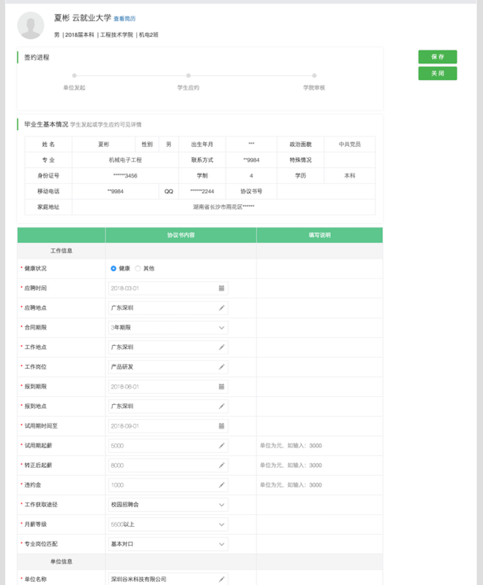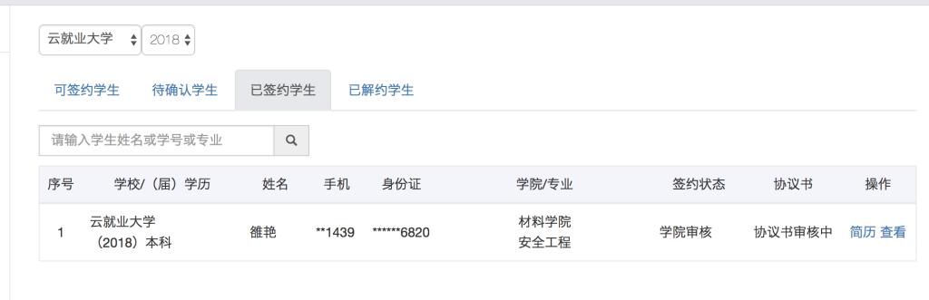 签约管理主要有5大功能:(1)查看各种状态的学生(可签约、待确认、已签约、已解约);(2)发起邀约;(3)修改邀约信息;(4)微信消息通知;(5)打印协议书;(6)发起解约申请(具体需要学校是否开放单位解约申请通道)。