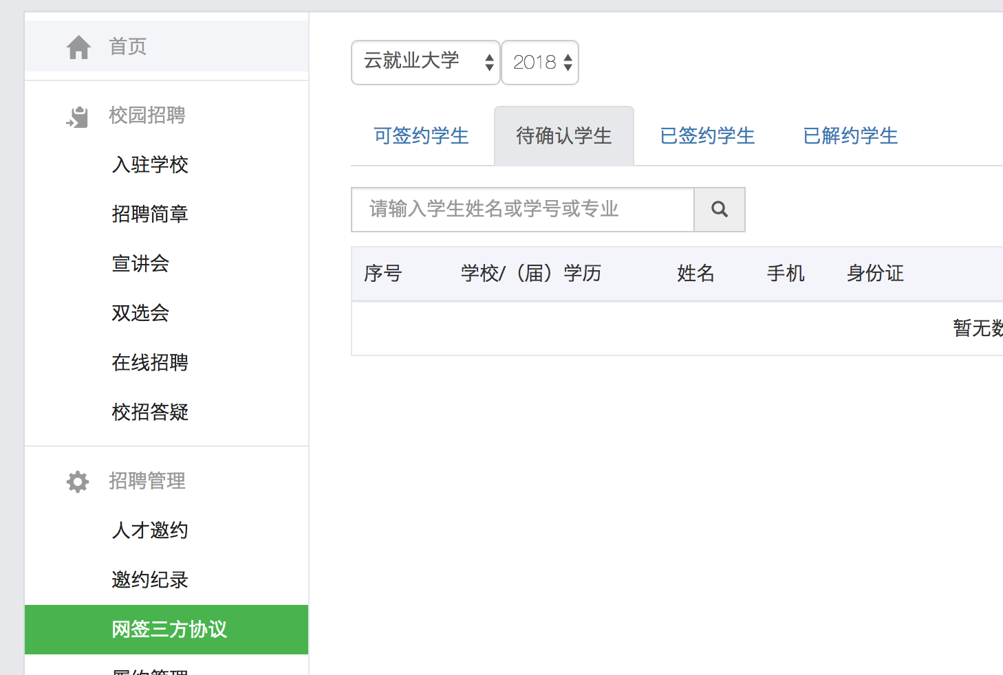 点击“网签三方协议”菜单,默认进入当前签约待确认的学生列表界面。