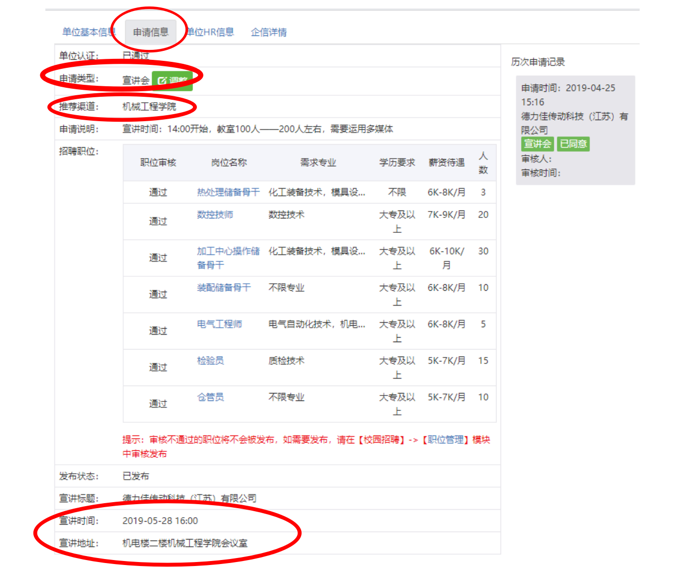 企业在提交“申请信息”时,“申请类型”选择“在线招聘”或“宣讲会”;“推荐渠道”填写“yl6809永利集团”。如果选择“宣讲会”,“宣讲时间”填写到5.27以后,“宣讲地址”填写“机电楼二楼yl6809永利集团会议室” 。
