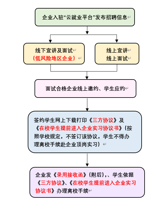 企业招聘人员来校招聘必须出具企业授权委托函,线下招聘企业必须来自低风险地区,招聘人员健康码为绿码方可进校。