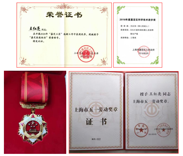王红亮2011年荣获安川首钢机器人有限公司上海分公司首届先进个人,2016年他所负责调试的项目荣获嘉定区科学技术进步奖,2018年荣获嘉定区总工会工匠训练营优秀学员称号,2020年获嘉定工匠技能标兵称号,同年成立嘉定区技能创新工作室并获上海市首席技师称号,2021年荣获上海市五一劳动奖章……一个个奖项和荣誉纷至沓来,这都是对他多年来苦练技能最好的肯定!