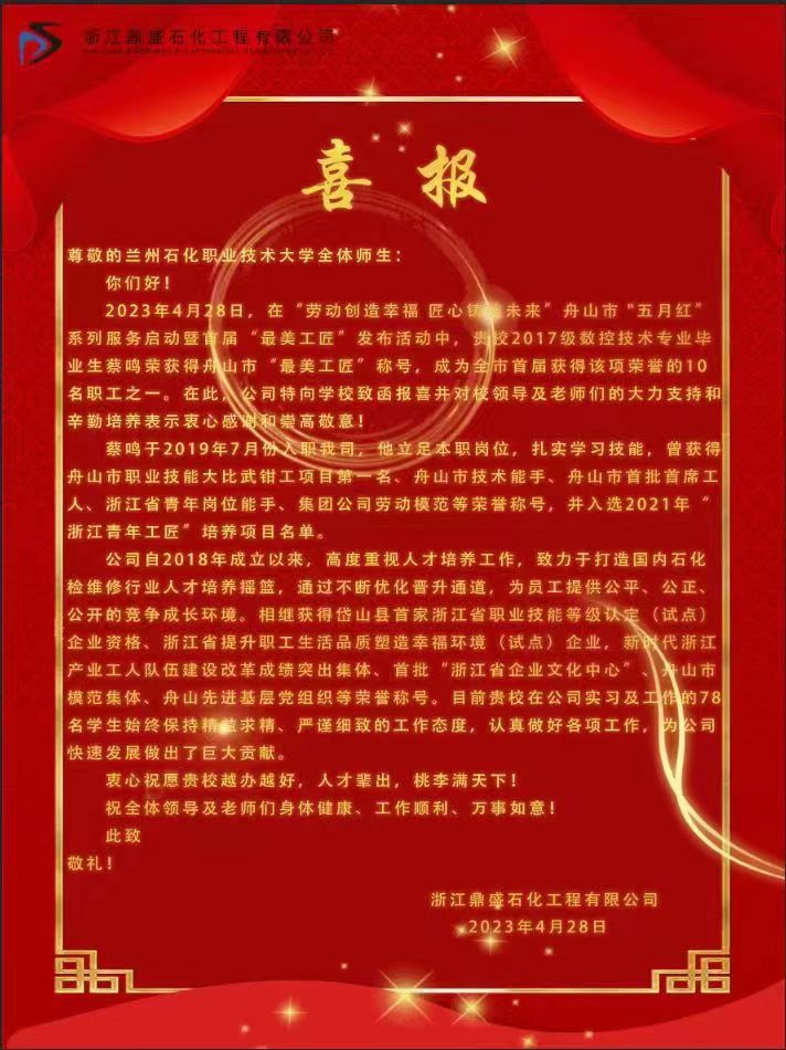 近日,学校收到浙江鼎盛石化工程有限公司发来的喜报,2023年4月28日,在“劳动创造幸福 匠心铸就未来”舟山市“五月红”系列服务启动暨首届最美工匠发布活动中,学校2020届数控技术专业毕业生蔡鸣荣获舟山市“最美工匠”荣誉称号,成为舟山市首届获得该项荣誉的10名职工之一。