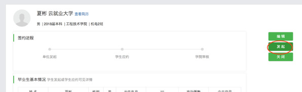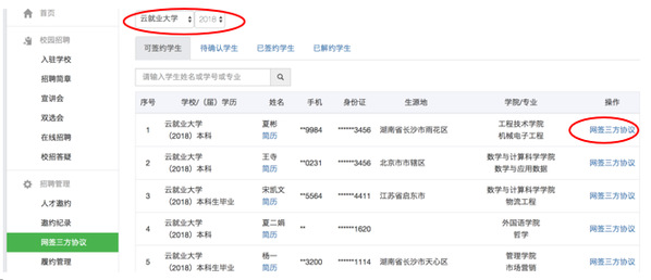 3.网签三方协议。进入“招聘管理—网签三方协议”管理页面,切换入驻的学校和毕业年份,点击“可签约学生”,找到目标学生,点击该生右侧操作栏的“网签三方协议”,按要求填写完整相关信息,保存后刷新,即可对该生发起邀约申请。如未找到目标学生,请线下联系就业负责人。