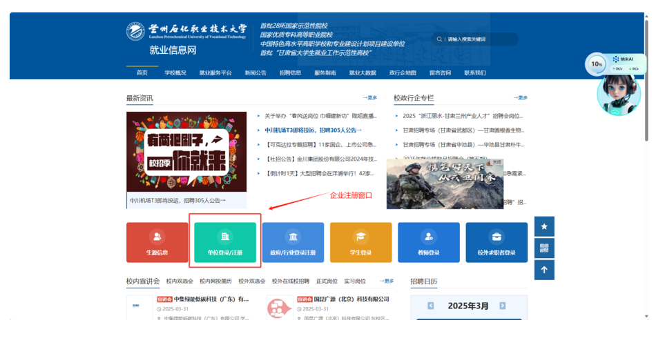 1.进入yl6809永利主页“招生就业—就业信息”,“单位登录/注册”进行登录。(https://lzpuvt.bysjy.com.cn/)