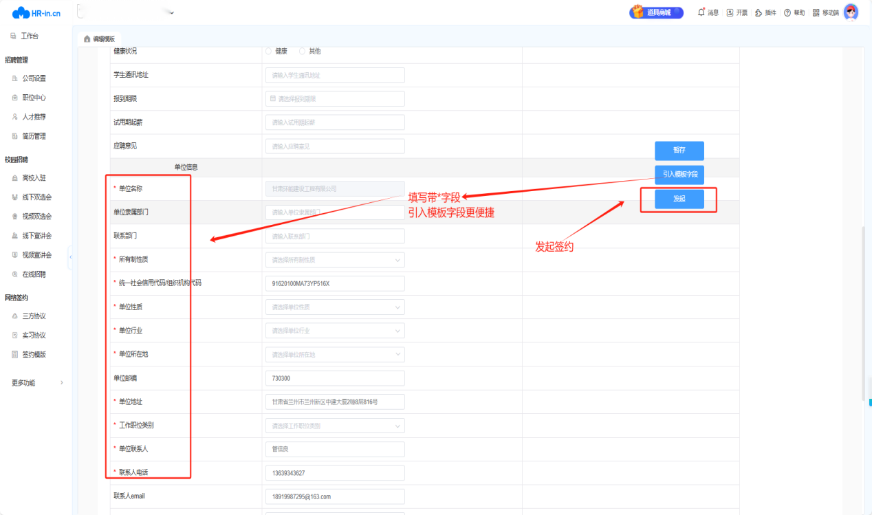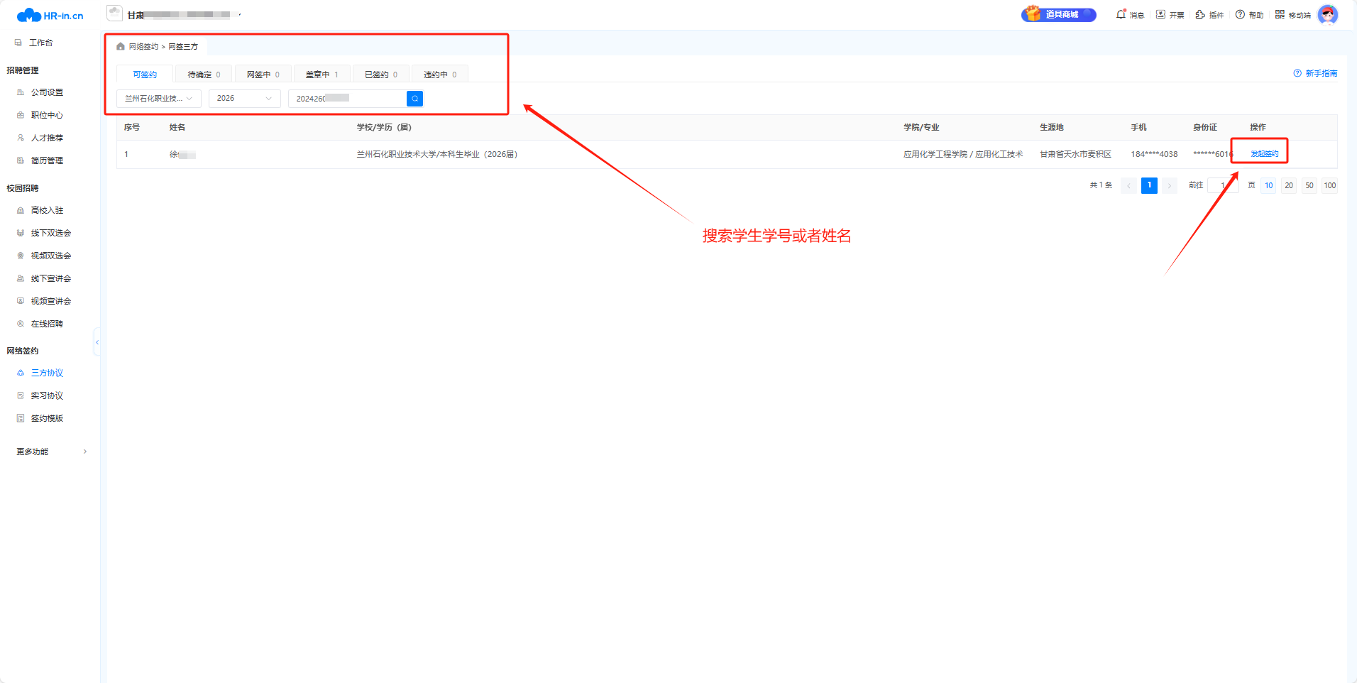 6.网签三方协议。进入“网络签约—三方协议”管理页面,切换入驻的学校和毕业年份,搜索目标学生,按要求填写完整相关信息,点击“发起”即可对该生发起邀约申请。如未找到目标学生,请线下联系就业负责人。
